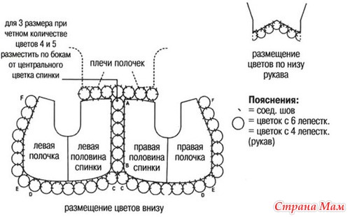 Выполнить все швы. Из пряжи Victoria связать 45 (47/53) 59 цветочков с 6 лепестками. Пришить их так: 6 (6/7) 8 от А до В, 9 (9/10) 11 от С до D, 8 (8/9) Ю от Е до F, 7 (7/8) 9 от G до Н. Внимание! Для 3 размера при четном количестве разместить 4 и 5 цветок по обе стороны от цветка в центре спинки. Соединить цветы 3 возд. п. по лепестку и пришить потайным швом к полотну по 3 возд. п. на лепестках. Выполнить 12 цветочков с 4 лепестками и разместить по 6 на рукав, как описано для спинки и полочек. Вставить рукава. Обвязать всю работу и низ рукавов крючком пряжей Louxor по схеме бордюра.