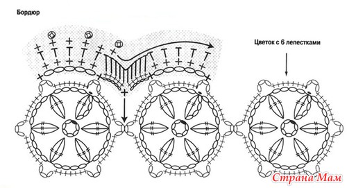 Плотность вязания: лиц. гладью пряжей Muguet: 26,5 п. и 40 р. = 10 х 10 см; цветок с б лепестками: диаметр = 5 см; цветок с 4 лепестками: диаметр = 4 см.