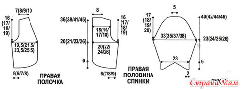 Чтобы связать правую половину спинки нужно пряжей Muguet набрать 16 (19/22) 25 п. и вязать лиц. гладью, прибавляя слева в каждом 2 р. 3x4,5x3,2x2,1x1 п. и справа 6 (6/2) 0x1 п. в каждом 10 р., 0(2/8) 12x1 п. в каждом 8 р. Получится 54 (59/64) 69 п. Через 20 (21/23) 26 см от начала для проймы закрыть справа в каждом 2 р. 0 (1/1) 1x5, 1 (1/1)2x4,2(1/2) 2x3, 1 (1/1)0x2, 1 (1/0)0x1 п. Останется 41 (44/47) 50 п. Через 36 (38/41) 45 см от начала вязания для скоса плеча закрывать справа в каждом 2 р. 3x6 (7/8) 9 п. Оставшиеся 23 п. выреза горловины закрыть. Левую половину спинки нужно вязать в зеркальном отражении.