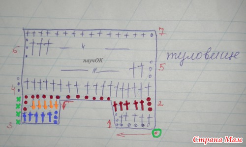 начинаем вязание из цепочки в. п. (точка зеленая - это первая петля), далее по схеме по стрелкам (3 ряда ст с накид, 6 в. п. - формируем ухо, 4 ст без нак (лоб), формируем второе ухо) и в конце жирные крестики бордового цвета - это ст без накида, которыми обвязываем нижнюю часть мордашки по периметру - на схеме всего 3 ст, так как не хотелось загромождать схему крестами..