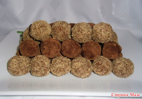 здесь в виде конфеток, скатать шарики, обвалять в молотых орехах, в какао