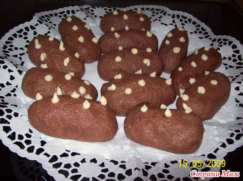 Печенье пропустить через мясорубку. Сгущенку смешать с маслом, добавить какао и вино, добавить печенье, все смешать. Сформировать пирожные, сделать ростки (1 ст. л. мягкого слив. масла, 1 ст. л. сахарной пудры)