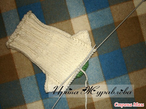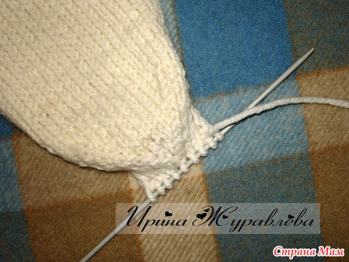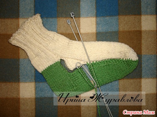 Переснять петли с булавок на парные длинные спицы, а петли с пяточной части - на булавки.