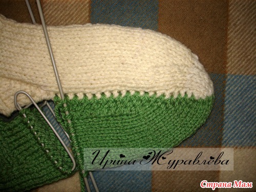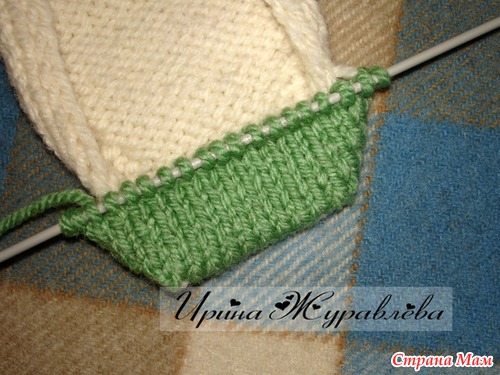 Затем взять в работу вышеуказанные 22 ЛП, остальные переснять на булавки. Присоединить контрастную нить (у меня зелёная). Через 22 ряда распределить петли на три спицы (7*8*7 петель), сформировать пятку (вязать обычную прямую, или квадратную, пятку) : через 14 рядов набрать с боковых стенок по 7 петель и провязать ещё 12 рядов. Особо заострять внимание на вывязывании пяточки не стану - в интернете море информации на эту тему.