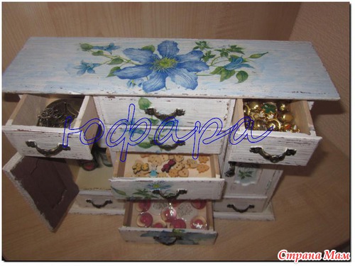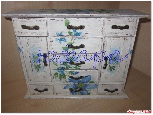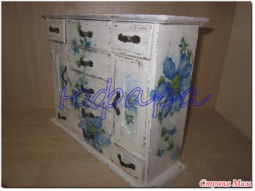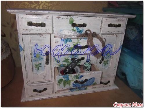 я как то близко с декупажем не соприкасалась, но мал по малу то там что то надо такое что то тут, вот и решила тоже познакомиться поближе. оказывается это так интересно, конечно я не профессионально все сотворила, попробовала на деле применить то о чем прочитала (например потертости), да и потом не получается еще без складок приклеивать... но все равно первые работы онии всегда дороги)