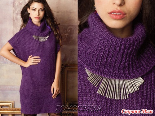 Туника с объемным воротником связана спицами рельефной резинкой. Описание дано для размеров S (M, L, XL, 2XL).