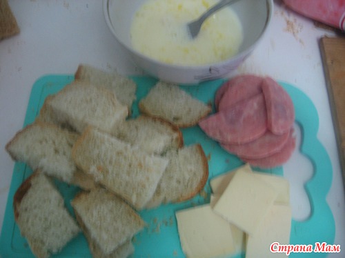 Режем хлеб, размешиваем яйца с молоком, солью, нарезаем пластинками ветчину и сыр.