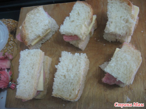 Между двумя кусочками хлеба укладываем во пластинке сыра и колбасы