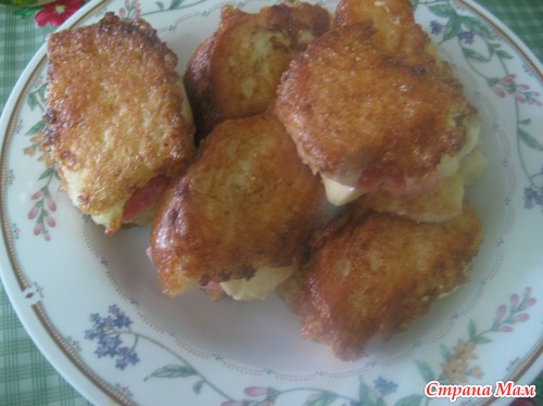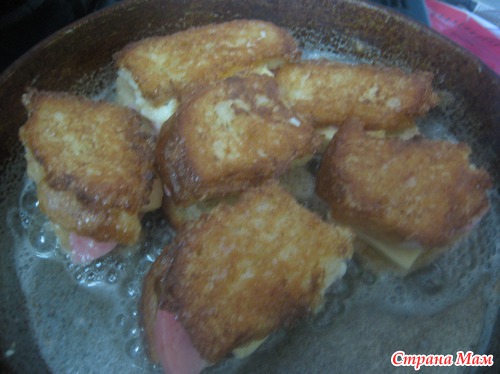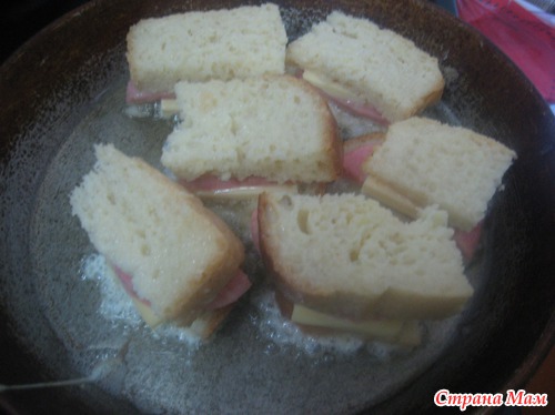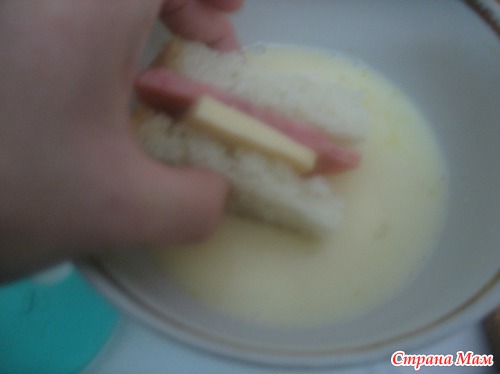 Совет: сильно не обмакивать, чтобы яичная смесь не сильно попадала между хлебом, а то плохо прожарится. Жарить на медленном огне, чтобы сыр успел немного расплавится.