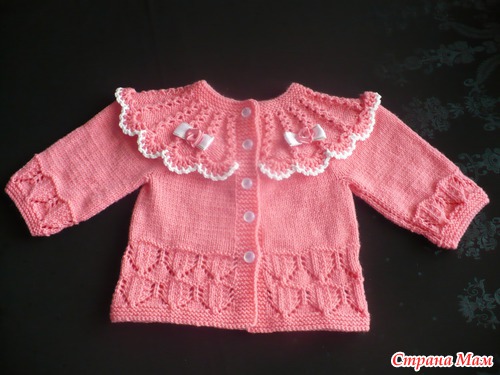 Спасибо, описания нет, вязала так, начало с горловины, набрала 75 п вместе с плаанками, 10ряов платочной вязкой, потом ажурные дорожки, между ними изнаночные.Для расширения кол-во изнаночных увеличивала.Потом вязание разделила на 4 части: 2 рукава , спинка,перед Схему узора добавила, спинка и полочки одним полотном, и планки тоже сразу вязала