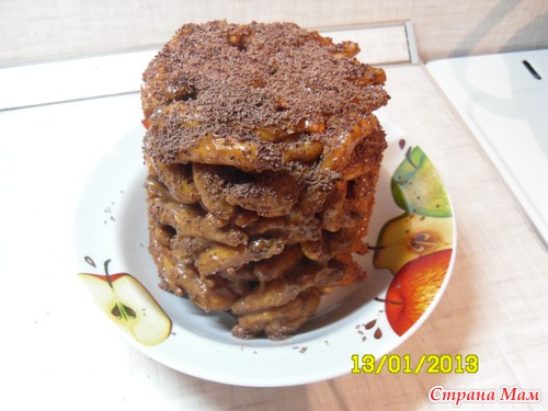 Теперь перемешиваю между собой крем, печенье и орехи. Выкладываю эту смесь на тарелку и мокрыми руками формирую горку. Но еще можно любую форму смазать немного растительным маслом и сложить туда смесь, а когда застынет просто перевернуть на блюдо. Убирать торт в холодное место (летом в холодильник, зимой на балкон, чтоб быстрее застыл). Все, примерно через полчаса торт можно доставать и пробовать. Получается очень вкусно. Но если у вас толстенькое печенье, то чем дольше торт простоит, тем вкуснее будет. А еще сверху можно покрошить шоколад.