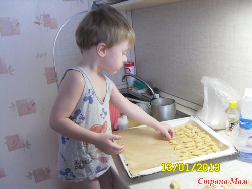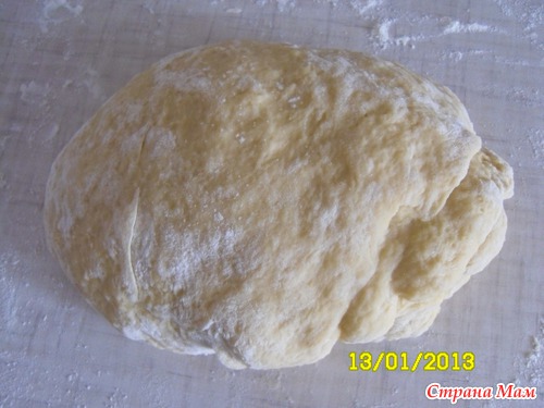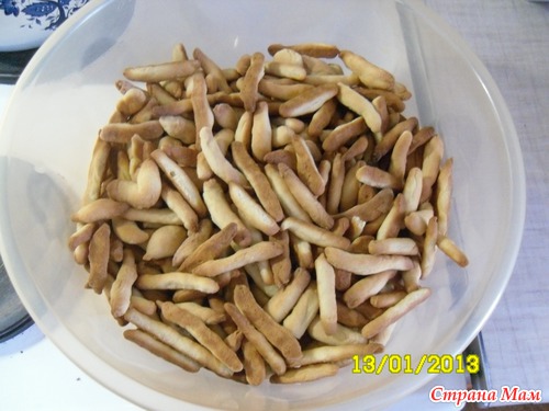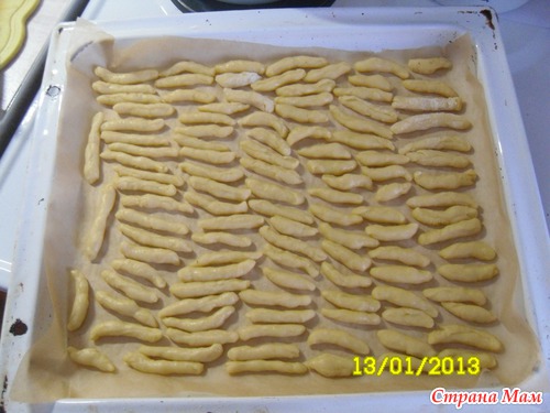 Тесто охладилось. У кого есть мясорубка, то пропустить тесто через мясорубку, отрезая ножом кусочки, размером примерно 8-10 сантиметров и выкладывать их на противень, посыпанный мукой. У меня мясорубки нет, поэтому мне пришлось нарезать тесто небольшими палочками.