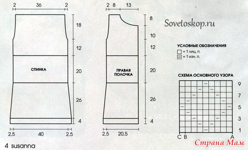 Спинка: на спицы № 5,5 нитью Kross набрать 55 п. и связать 4 р. двойной резинкой. Перейти на спицы № 7 и связать 6 р. резинкой 2/2, далее вязать основным узором. Через 30 см вязать узором из сот, равномерно прибавив в 1-м р. 15 п. Через 50 см вязать резинкой 2/2, равномерно убавив в 1-м р. 1 х 12 п. Через 62 см от наборного края для скосов пройм закрыть с обеих сторон 1 х 1 п. и далее провязывать крайние с обеих сторон 3 п. двойной резинкой, убавляя после 3 первых и перед 3 последними петлями в каждом 2-м р. 2 х 1 п. Через 80 см закрыть оставшиеся 52 п.