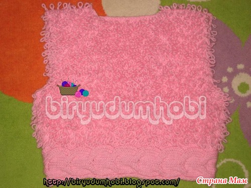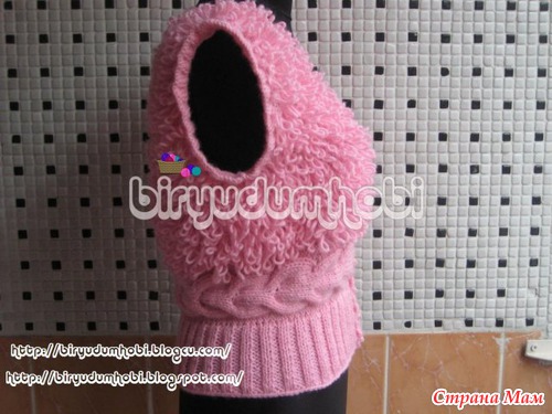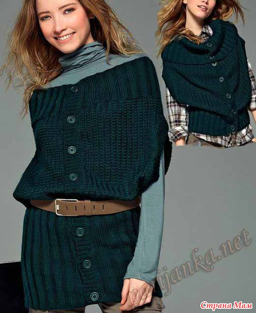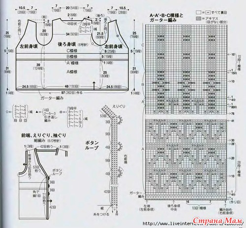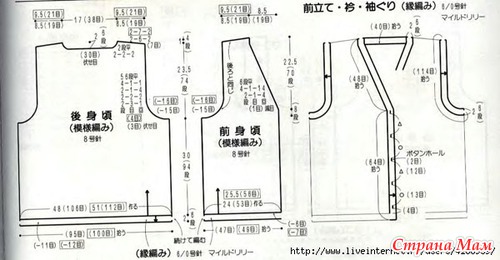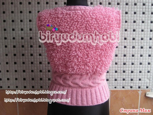 Думаю, здесь все понятно. Сначала вяжется полоса с косой. Затем, по краю набираются петли, и одним полотном вяжется до проймы, затем вязание разделяется на три: спинка и две полочки... Затем, по низу полосы с косой набираются петли и вяжется резинка. По бокам полочек набираются петли и вяжется резинка. Просто... а вариантов может быть великое множество.
