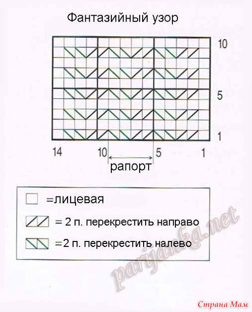 - фантазийный узор: спицы 4,5 мм, кол-во петель кратно 4+2