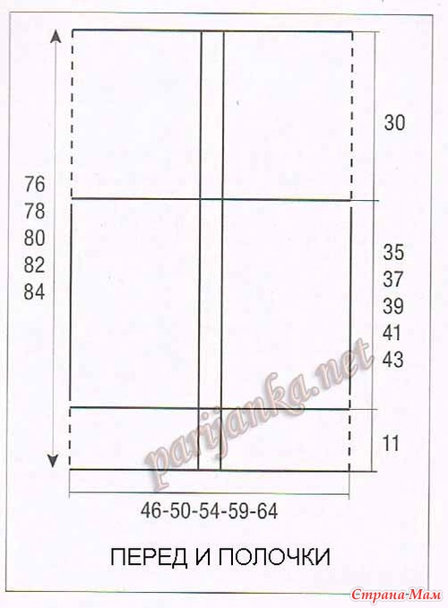 53-57-61-67-73 петли (+1=54-58-62-68-74 п.) на высоту 25-27-29-31-33 см (70-76-82-88-92 р.), убавить 1 петлю справа в последнем ряду.