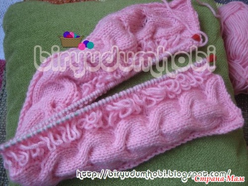 На высоте 46-48-50-52-54 см (132-138-144-150-154 р.) перейти на спицы 3,5 мм и вязать резинкой 4х4.