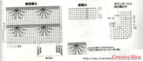 Правая полочка: на спицы № 5,5 нитью Kross набрать 29 п. и связать 4 р. двойной резинкой. Перейти на спицы № 7 и вязать первые 3 п. двойной резинкой, следующие 2 п. резинкой 1/1 и остальные петли резинкой 2/2. Через 4 см вязать первые 5 п. по рисунку, остальные петли основным узором. Через 30 см для планки кармана отложить первые 8 п., на следующих 14 п. связать 4 р. резинкой 2/2 (отложив также оставшиеся 7 п.) и закрыть эти 14 п. Отдельно для мешковины кармана на спицы № 5 нитью Prima набрать 25 п. и связать 15 см лиц. гладью, перейти на спицы № 7 и связать нитью Kross 2 р. лиц. гладью, равномерно убавив в 1-м р. 1 х 11 п. Соединить на одной спице первые отложенные 8 п. полочки, 14 п. кармана и последние отложенные 7 п. полочки; вязать узором из сот, равномерно прибавив в 1-м р. 1 х 12 п. Через 50 см от наборного края вязать резинкой 2/2, равномерно убавив в первом ряду 1 х 10 п. Через 62 см от наборного края для скоса проймы закрыть слева 1 х 1 п. и далее провязывать последние 3 п. двойной резинкой, при этом убавляя перед 3 последними петлями в каждом 2-м р. 2 х 1 п. Через 72 см для выреза горловины закрыть справа в каждом 2-м р. 1 х 6 п., 2 х 3 п., 1 х 2 п. и 2 х 1 п. Через 80 см от наборного края закрыть оставшиеся для плеча 12 п.
