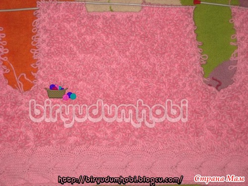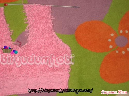 Продолжить на полученных 54-58-62-68-74 п. на высоту 25-27-29-31-33 см (69-75-81-87-91 р.), убавить 1 петлю слева и отложить петли.