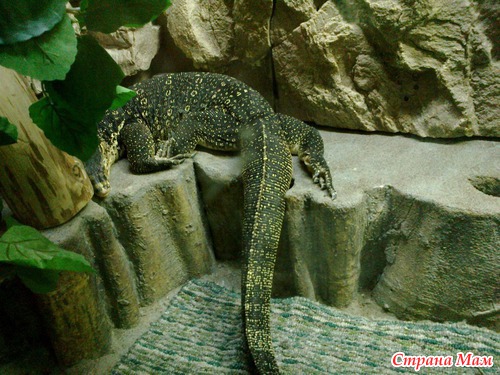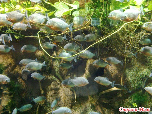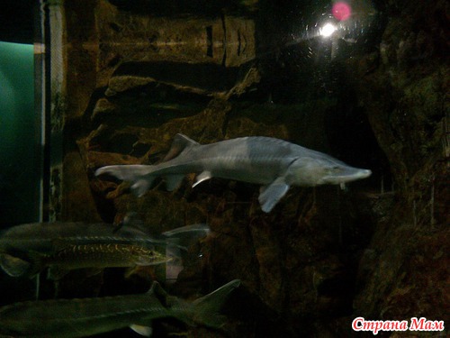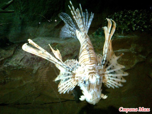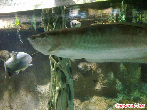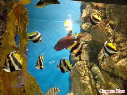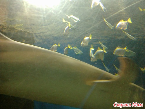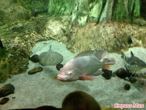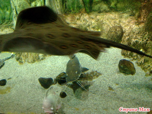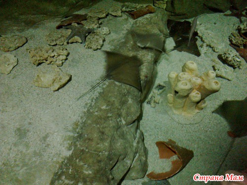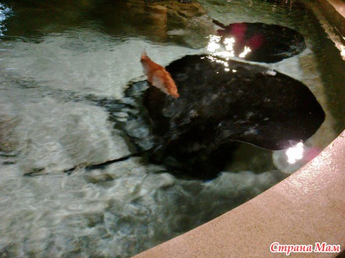 А это - моё самое большое впечатление! Здоровенные чёрные скаты размером больше двухспальной протыни; плавают, еле шевеля "крыльями", в открытом бассейне с активной циркуляцией воды. А другие, серые хвостоколы, просто летают. И надпись: не опускать в воду руки, опасно для жизни!