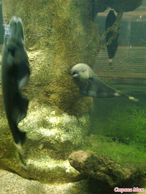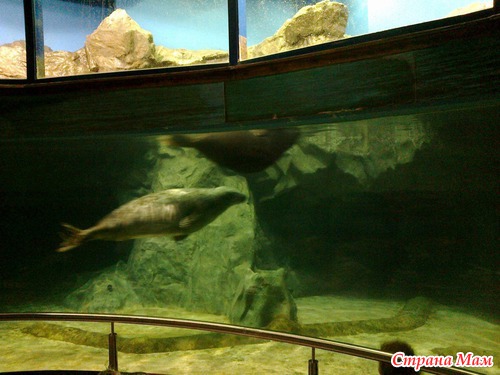 Семейка тюленей. Снимать трудно, вода мутновата, да ещё они очень активно двигаются. Они - умницы такие! Очень охотно общаются с людьми, показывают разные трюки, улыбаются усатыми мордочками. Вообще-то, ластоногие дают представления в дельфинарии, надо и туда как-нибудь выбраться.