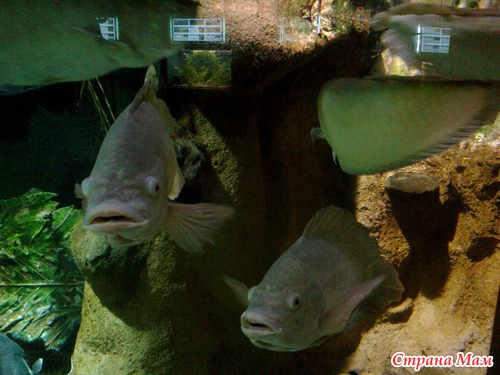 А это - моё самое большое впечатление! Здоровенные чёрные скаты размером больше двухспальной протыни; плавают, еле шевеля "крыльями", в открытом бассейне с активной циркуляцией воды. А другие, серые хвостоколы, просто летают. И надпись: не опускать в воду руки, опасно для жизни!