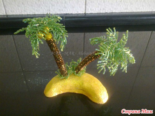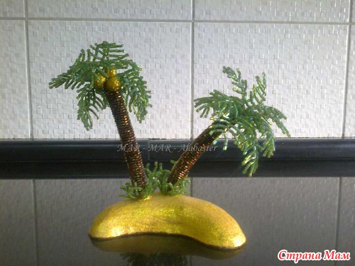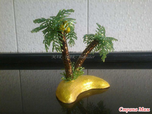 Придумалась пальмачка у меня сама, нигде этому не училась. Но будучи педантичным человеком, решила поискать в интернете подобные работы - ОЧЕНЬ МНОГО!, по ходу дела наткнулась на папоротник из биссера - схема моих пальмовых веточек оказалась копией веточек папоротника. Ну а остальное дорабатывала сама.