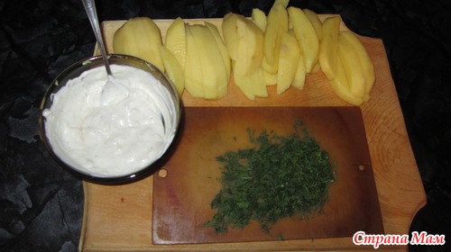 Картошку нарезать брусочками, зелень мелко порезать, майонез смешать с давленым чесноком