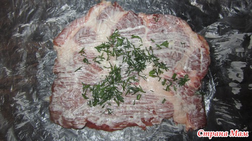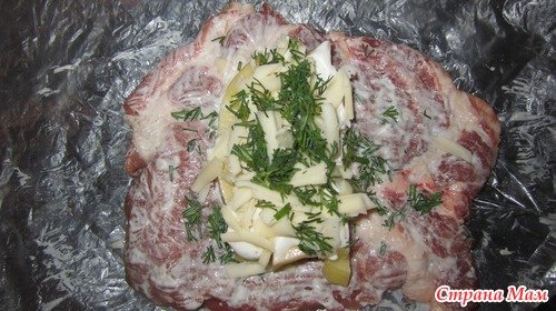 На мясо выкладываем зелень, картошку, сверху тертый сыр, зелень (картошку можно немного посолить)