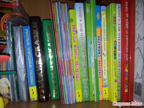 Это её полочка, книг конечно не так много еще, но она их по 100 раз на день рассматривает, почти все стишки выучила и сказку рассказать может не читая