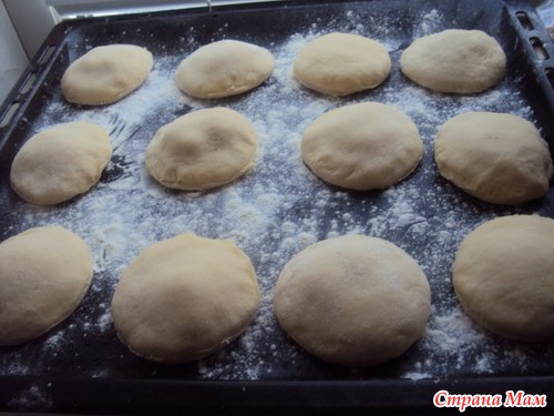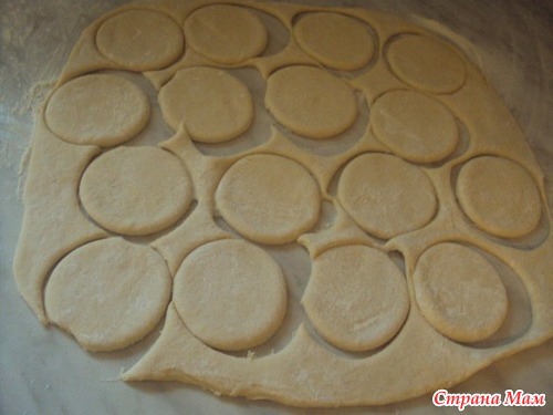 Прикрыть другим кружочком и слегка прижать края (можно перед этим края смазывать молоком, чтобы тесто лучше прилипло) и вырезать тем же стаканом круг, чтобы защипнулись края.