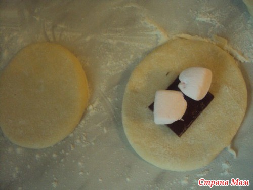 Положить в центр кружочка квадратик шоколада и2 небольших кусочка маршмеллоу.