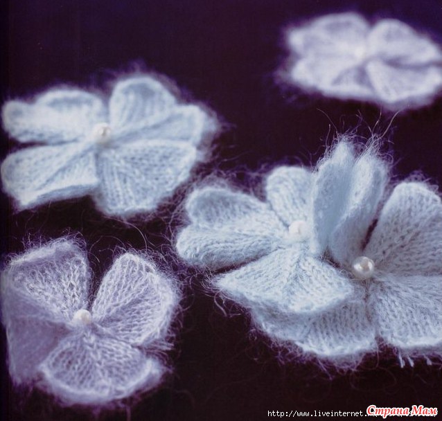 Затем собрать все 4 лепестка на одну спицу, провязать 1 ряд изнаночкыми, затем собрать все п. на нить, затянуть и закрепить.