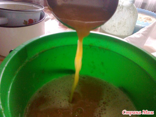 Готовим сырой сок. На 1 литр перетёртого пюре добавляем 1 литр воды и 100 грамм сахара. Перемешиваем до полного растворения сахара.