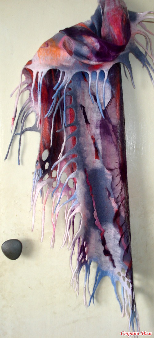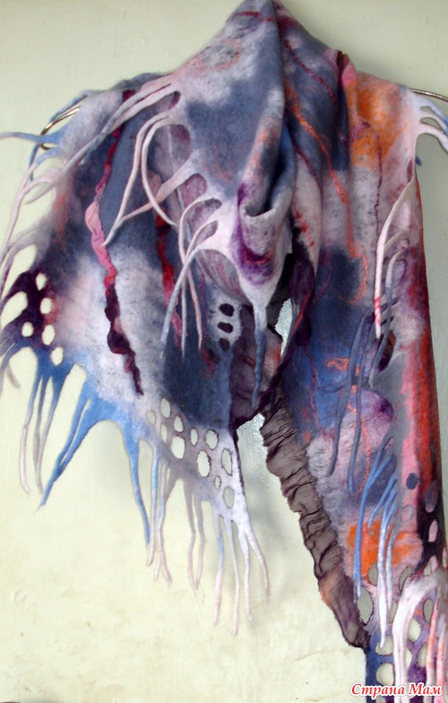 Палантин выполнен в технике нунофелтинг(приваливание шерсти к ткани). Шерсть 100% +натуральный шелк. Ручная работа. Двусторонний.