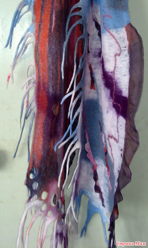 Палантин выполнен в технике нунофелтинг(приваливание шерсти к ткани). Шерсть 100% +натуральный шелк. Ручная работа. Двусторонний. Р-р.2,3м на 45см с кистями. Читать полностью