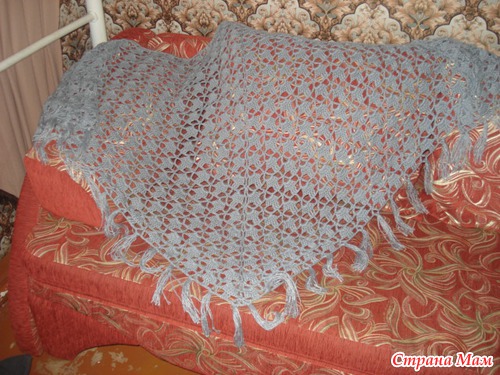 А это моя последняя работа, шаль для мамочки, пряжа Семеновская Каролина, акрил, 438м/100 г, крючок №2. Схему если надо добавлю.
