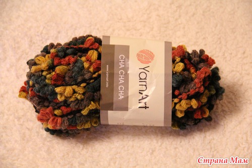 и 1,5 мотка YarnArt CHA-CHA-CHA. Шарф связан платочной вязкой, в середине проходит коса на 10 петлях.