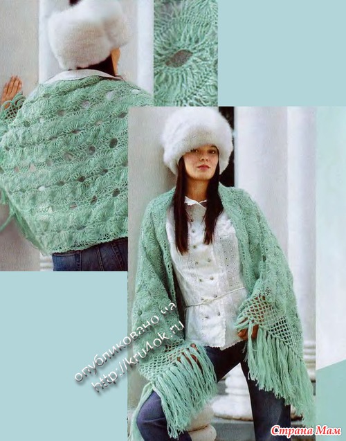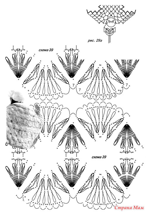 На вилке вяжите полосы длиной 16 раз по 24 петли с каждой стороны. Далее обвяжите каждую полосу по схеме 36. После этого соедините пары полос, и только лотом соедините пары между собой. По торцам обвяжите палантин косой сеткой из 8-ми ВП. По длинным краям обвяжите арками из 5-ти ВП. Прикрепите к концам палантина кисти длиной 25 см, как на рис. 29а.