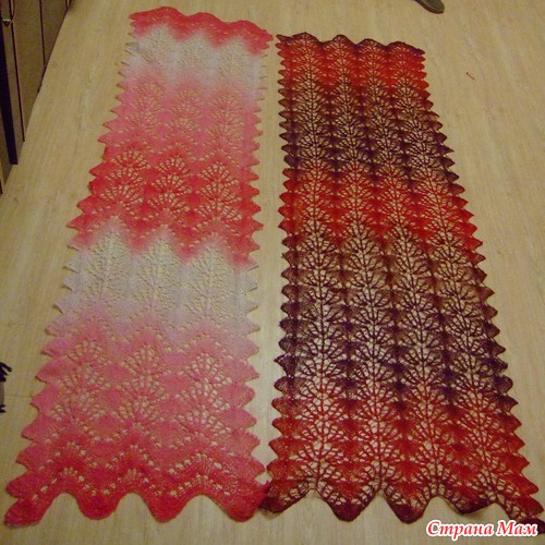 Розовый (поуже) вяжется на 95 петлях, а коричнево-вишнёвый на 125.