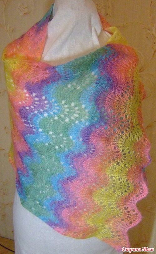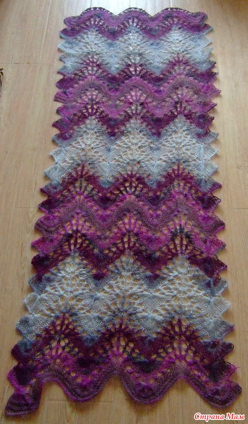 в английской схеме палантин состоит из двух рапортов чередующихся в произвольном порядке (один с дырочками, другой глухой). я пробовала чередовать эти рапорты, но пришла к выводу что очень сложно подогнать переход цвета к смене рапортов в результате все палантины вяжу только рапортами с дырочками. Если нужно я напишу и про рапорт без дырочек, вы тогда мне напишите