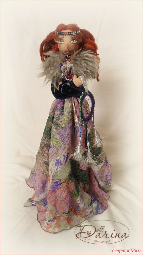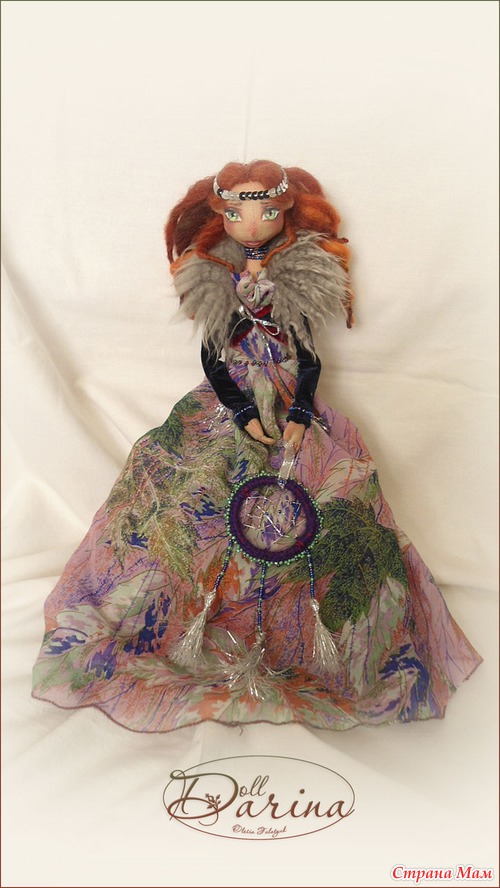 В работе были использованы синтепон, лён, шерсть для валяния, крепдышин, бархат, шкурка овцы, бисер, люрексовый шнур, паетки. Ручная роспись.