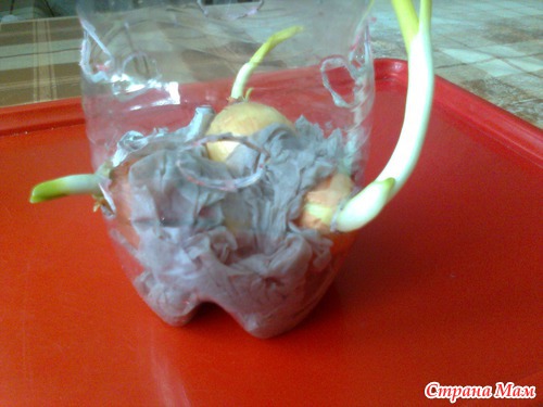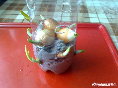 Сверху водружаем ещё три луковицы и, чтобы они были устойчивы, обкладываем мокрой бумагой. Всё, ждём зелень.
