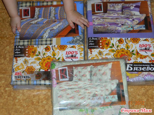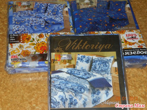 Вторую часть я не чаяла дождаться, прошло много времени и я уже устала переживать. Но тут Настя - Адриатика написала заявление на розыск и вуа-ля, 25 января я поехала и получила ее. Там было постельное белье. Впечатление неоднозначное. Никогда не видела бязь, похожую на марлевку. Она мягкая, приятная. но она не похожа на бязь. Комплект звездное небо (синий с планетами и звездами на фото) поразил запахом, а ногти стали синими, при трении. Посмотрим, что будет после стирки (минуту назад заглянула в машинку, водичка темно-синяя, попробую потом в уксусе подержать). Расцветки на картинках ярче, чем в реальности. Когда-то давно я купила на рынке недорогое голубое бязевое белье и темно синий пододеяльник, ни разу не линяло, да и качество ткани было другое. Посмотрю при использовании, но заказывать его не буду больше. Еще комплект из поплина: прелесть, ткань приятная, расцветка хорошая, в следующий раз его обязательно закажу.
