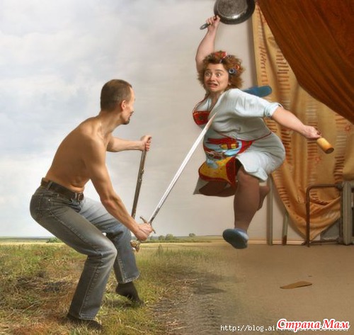 Мамочки мои! Что же делать?! Кого звать? Кровиночку мою избивают! Среди бела дня! Пока я в панике металась по балкону, мои дети, почистив зубы, высунулись из окна и стали болеть за папу. Наорав на детей и заперев их в кухне, я вернулась к театру боевых действий. Мужики бились не на шутку - у моего уже был оторван рукав, у бугая зрел фингал (мой-то ловчее оказался!). Пока я гордилась силой и ловкостью своего, бугай с размаху впечатал моему в лицо и разбил ему нос. Ну все! Пипец тебе, детина! У меня сковородка чугунная есть, ща я тебе покажу, как мужа моего обижать!