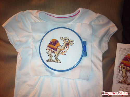 Все очень просто! Накладываете канву на футболку и закрепляете пяльцем, вышиваете сразу и на канве и на футболке, внимательно что бы на футболке не образовывались складки и неровности! Когда работа закончена, аккуратно обрезаете канву по краям! Все премудрости!