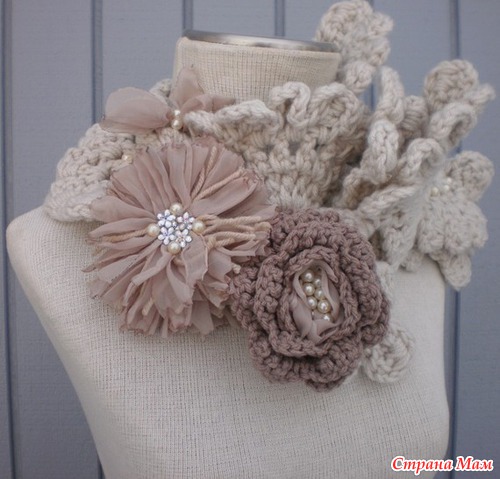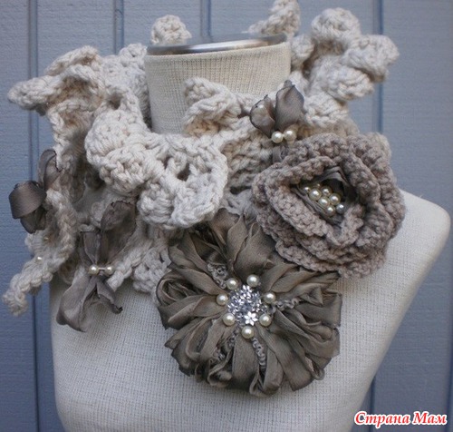 Ни разу не пробовала начинать онлайн, но примерно представляю, что и как... Начну с пятницы примерно вязать такой модный шарфик, нашла подборку схем. Модный аксессуар со сменными цветками-брошками дополнит любой наряд. А вариативность его не оставит никого равнодушным. Вязать буду из хлопка (250 метров в 50 граммах), но в 3 сложения. Есть ли желающие поработать со мной вместе???