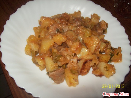 Картофель очистить от кужуры, промыть, порезать брусочками и отдельно поджарить. Жареный картофель положить к мясу и тушить вместе 10-15 мин. На гарнир подать овощной салат