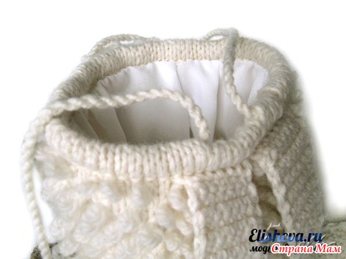 Стенки: набираем на спицы из петель последнего ряда дна по кругу 68 петель. При этом в начале и в конце ряда прибавляем для шва по одной петле, работу продолжаем узором из вытянутых петель до достижения высоты = 22 см. Далее выполняем лицевой гладью пять рядов (при этом отмечаем 5 средних петель – центр спинки рюкзака, там, где шов). В последующем ряду довязываем до отмеченных петель и далее поступаем следующим образом: 1 накид, две вместе лицевой, 1ЛП, две вместе лицевой, 1 накид (таким образом, образуется 2 отверстия под шнурок), до конца ряда – лицевая гладь. Выполняем еще два ряда. После чего, полоску лицевой глади отворачиваем внутрь рюкзака, пришиваем к последнему ряду открытые петли. С лицевой стороны – шов кеттлевка.