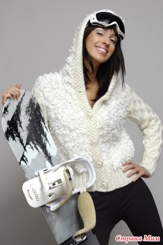 ВАМ ПОТРЕБУЕТСЯ 350 г белой пряжи GALIA (50% мериносовой шерсти, 50% полиамида, 50 м/50 г), 200 г пряжи TEBE цвета экрю (100% мериносовой шерсти Extrafine, 140 м/50 г), 160 г белой пряжи CAMELOT (67% мохера Superkid, 3% шерсти, 30% полиамида, 500 м/50 г), спицы № 4, № 5 и № 8, 5 пуговиц диаметром 3 см
